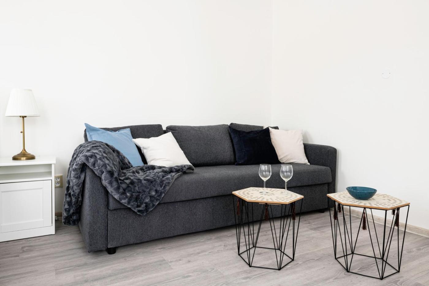 One-Bedroom Apartment. This apartment includes 1 living room, 1 separate bedroom and 1 bathroom with a shower. Guests can make meals in the kitchen that has a stovetop, a refrigerator, a dishwasher and kitchenware. The unit features a seating area, a washing machine, a tea and coffee maker and also has city views. The unit has 4 beds. ;