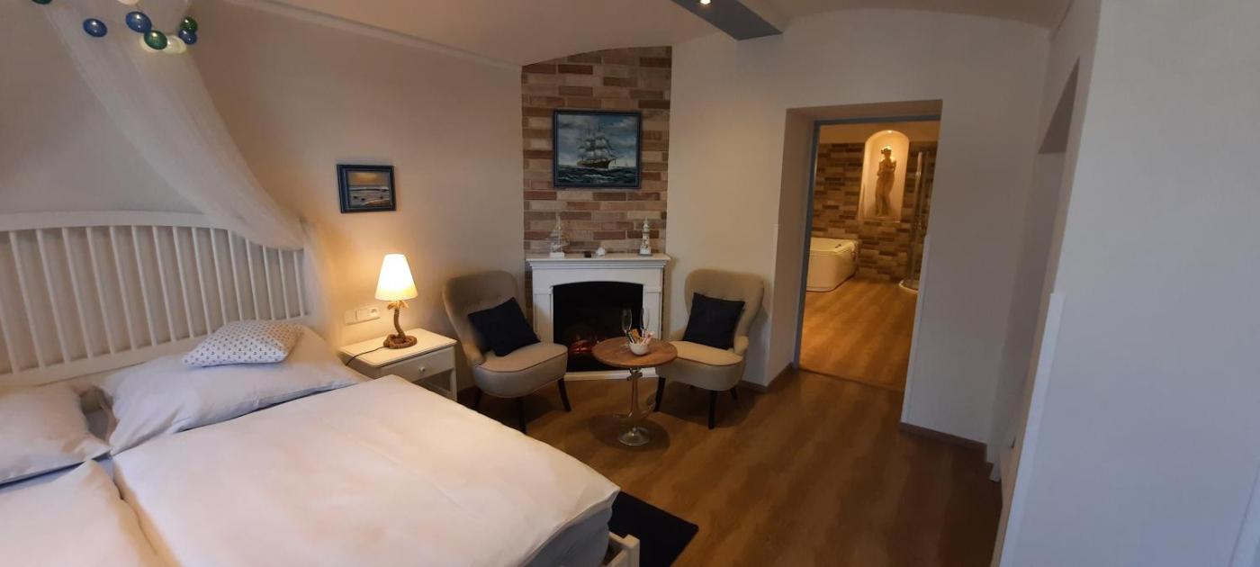 Luxury Suite with Spa Bath. This luxury suite features a canopy bed, a seating area with a fireplace, a kitchenette, a bathroom with a spa bath, an infra sauna, and a shower corner. This unit is accessible from the garden and is located on lowered ground floor. ;